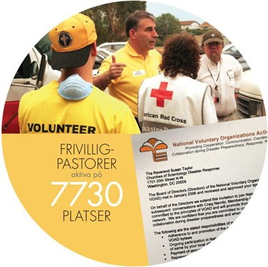 Frivilligpastorer arbetar tillsammans med frivilligorganisationer som är aktiva vid katastrofer (VOAD) frivilligpastorer arbetar tillsammans med andra VOAD-medlemmar och agerade vid tornador i Oklahoma, orkanen Sandy och bombningen under Boston Maraton. Frivilligpastorer innehar ledande befattningar inom olika statliga VOADs. I Washington D.C., arbetar en scientolog på styrelsen för National VOAD och är ordförande i DC-avdelningen, och som medlem av underkommittén för andlig och känslomässig omsorg, har han bidragit till riktlinjer för andlig och känslomässig omsorg under katastrofer.